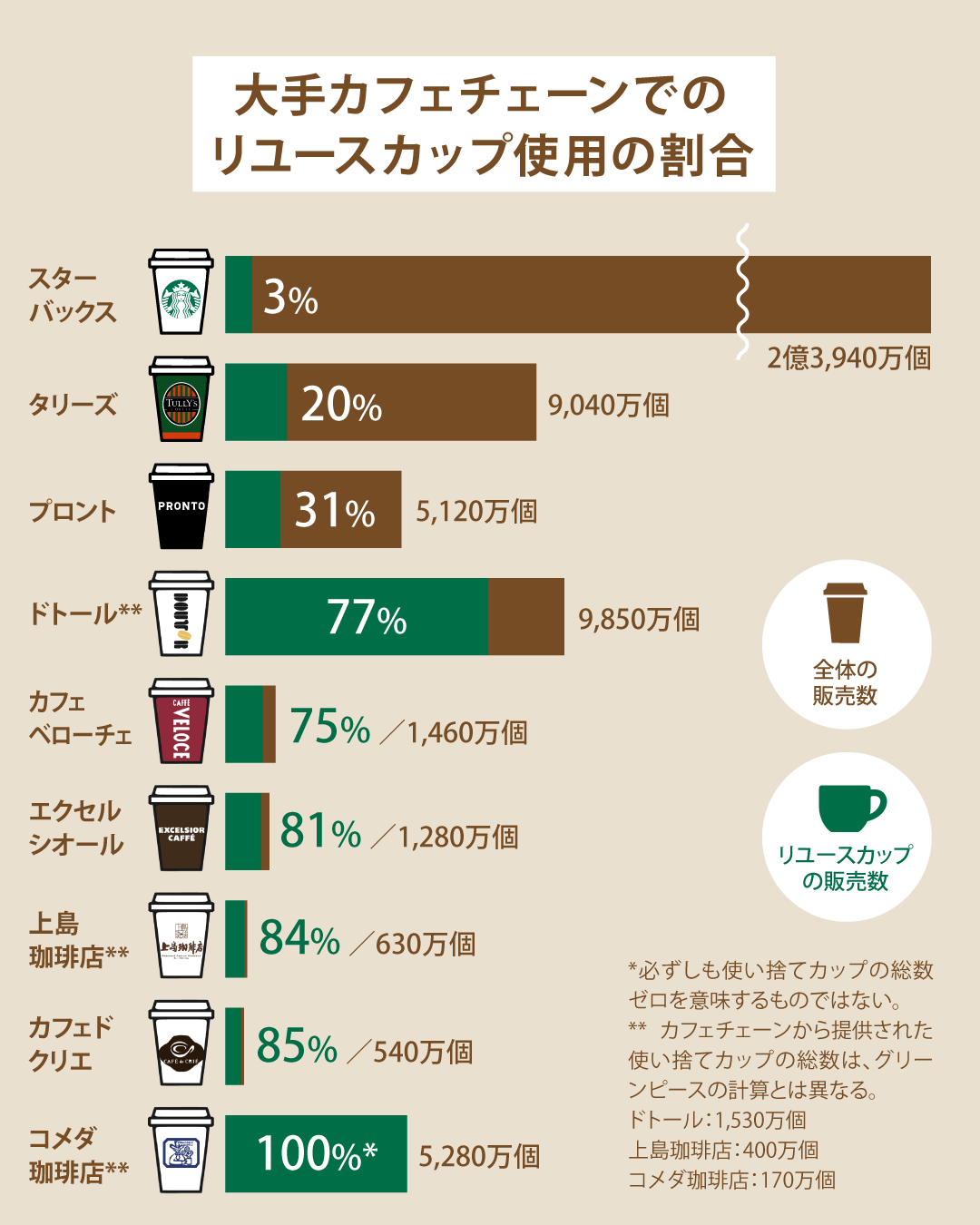 これは、入手可能な最新のデータ(※2)の分析と各店舗での実地調査から明らかになったことです。この調査により、日本で初めて、カフェチェーンごとの使い捨てカップ消費量が明らかになりました。
